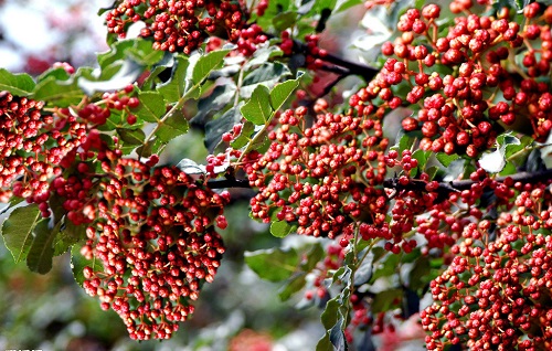 花椒可除各種肉類的腥氣;促進唾液分泌,增加食欲;使血管擴張,從而起到降低血壓的作用。一般人群均能食用,孕婦,陰虛火旺者忌食。果實呈圓形,綠豆大小,其外皮是一種常用香料。果實成熟時紅色或紫紅色果皮叫椒紅,種子叫椒目,都是中藥材,家庭常用調味品,多見于海拔2500米的坡地,也有栽種。耐旱、喜陽光,各地多栽種。